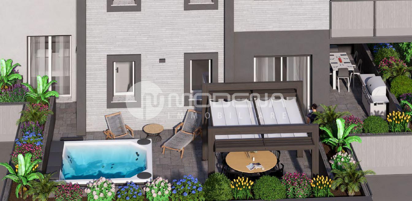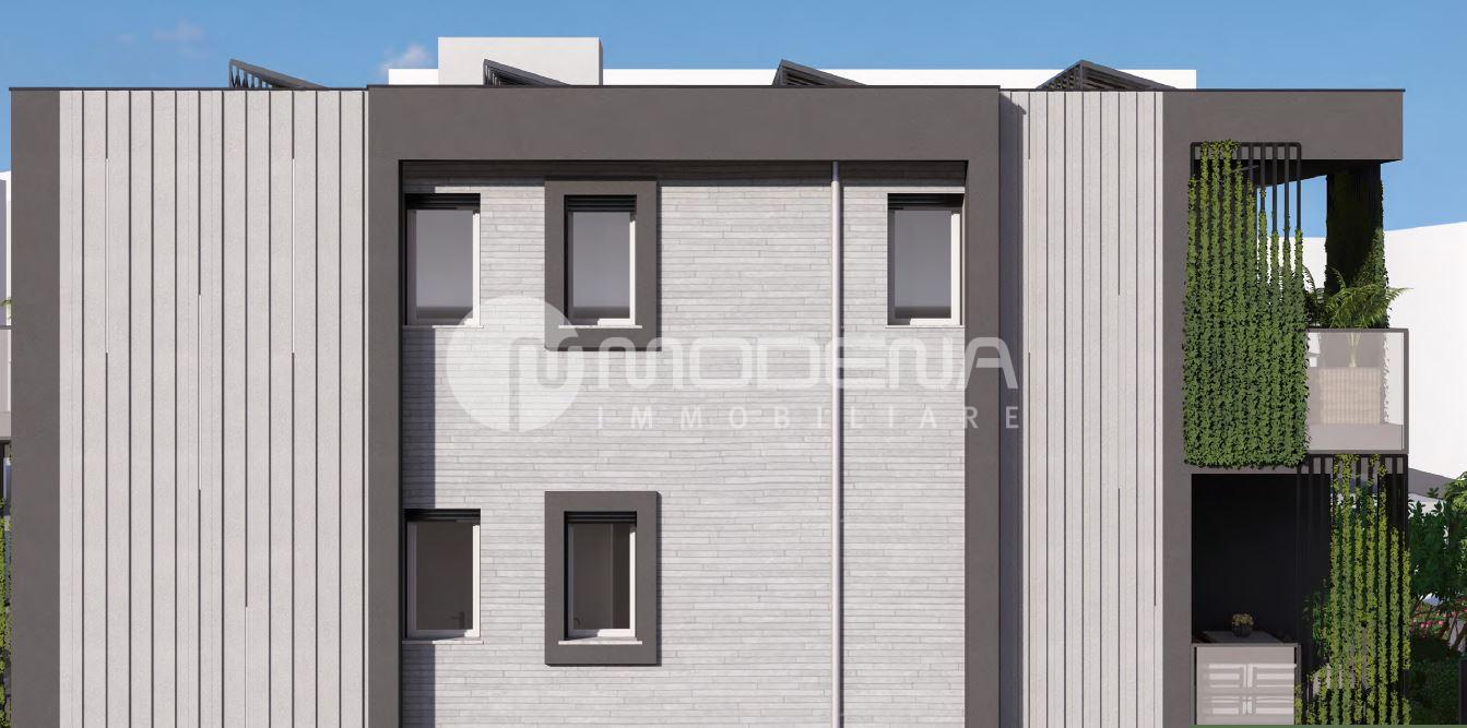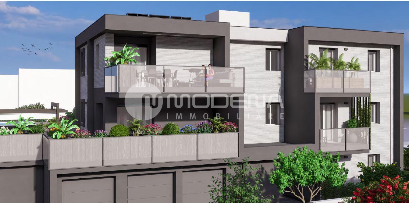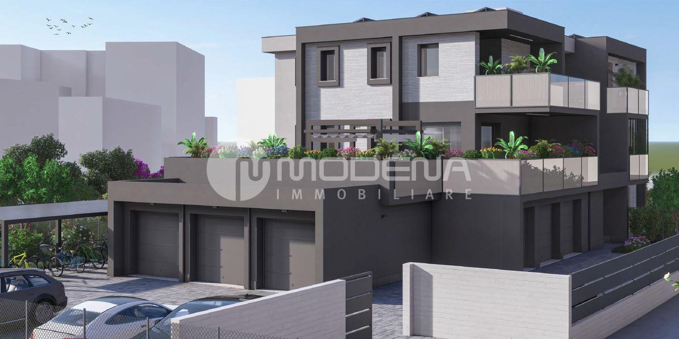 In palazzina di prossima realizzazione composta da 6 unità abitative, appartamento al piano primo composto da: ingresso, soggiorno con cucina a vista separabile e 100 mq di terrazzo, due camere matrimoniali e due bagni. Al piano terra garage e possibilità di posto auto.