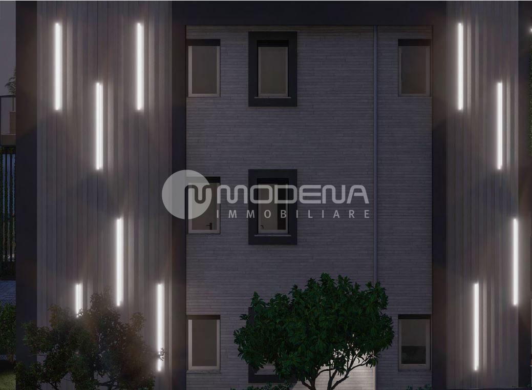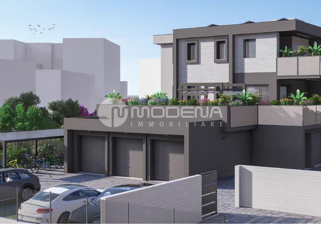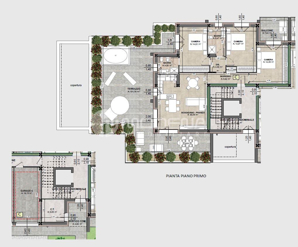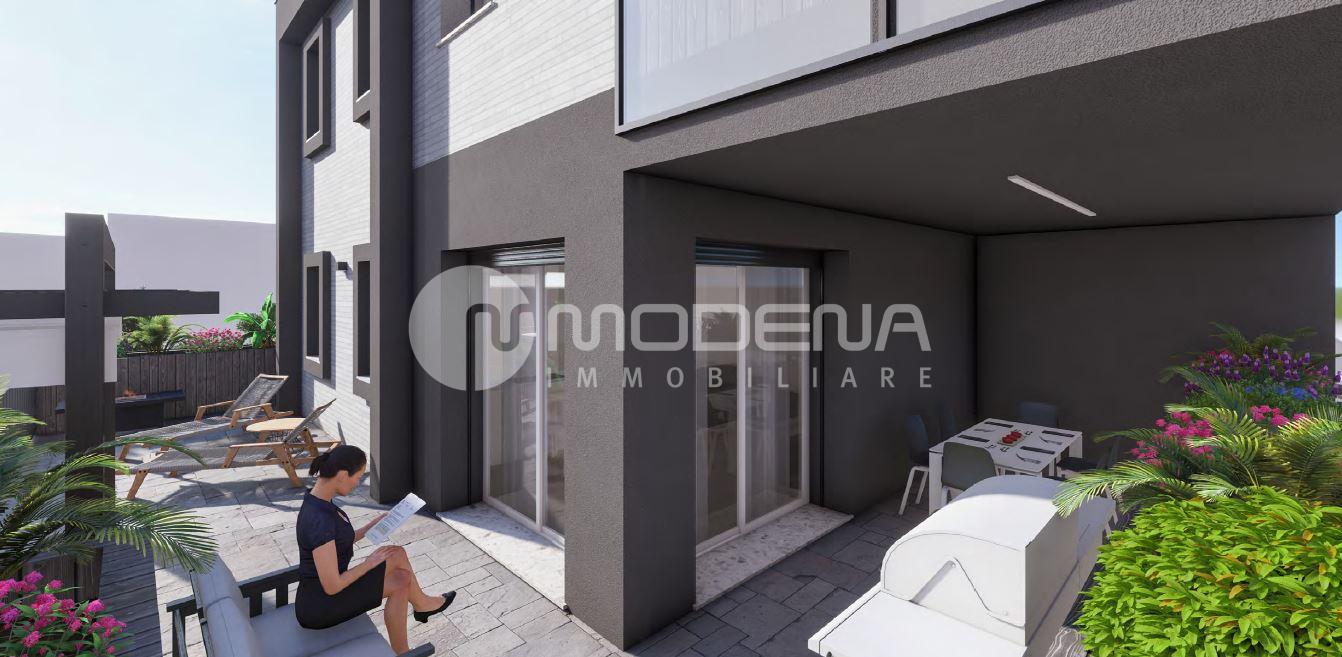 In palazzina di prossima realizzazione composta da 6 unità abitative, appartamento al piano primo composto da: ingresso, soggiorno con cucina a vista separabile e 100 mq di terrazzo, due camere matrimoniali e due bagni. Al piano terra garage e possibilità di posto auto.